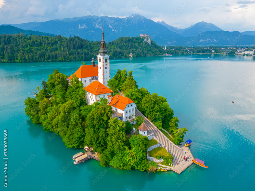 Aerial view of Assumption of Maria church at lake Bled in Sloven