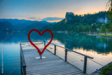 Sunset view over a romantic pier at lake Bled in Slovenia