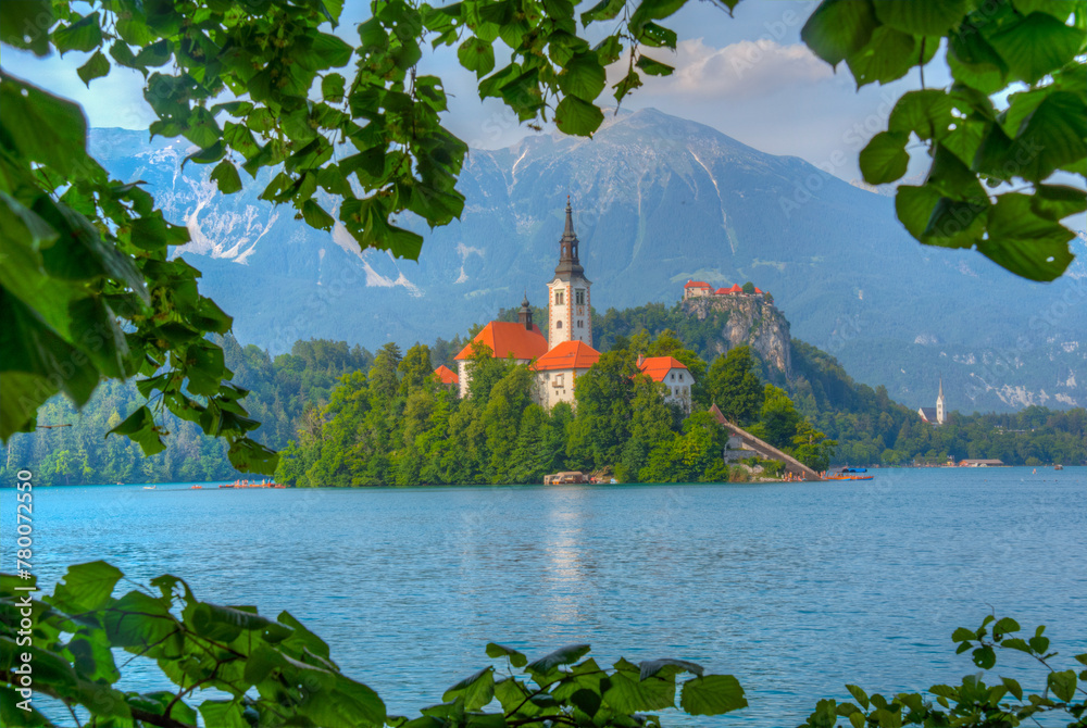 Assumption of Maria church and Bled Castle at lake Bled in Slove