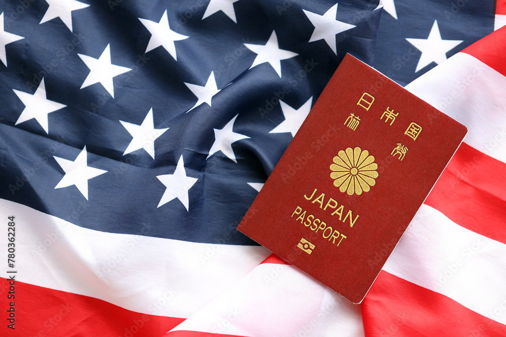 Japan passport on United States national flag background close up. Tourism and diplomacy concept