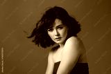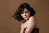 Portrait of beautiful young woman with wavy hairstyle on brown background