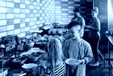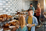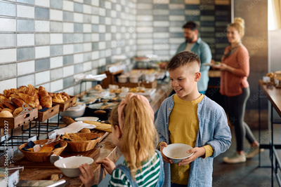 Happy boy and girl enjoying in buffet breakfast at hotel restaurant.