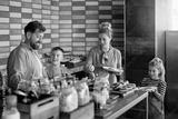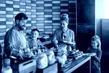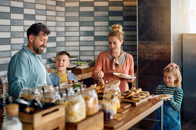 Happy parents and their kids enjoying in buffet breakfast in hotel.