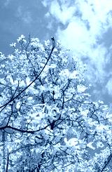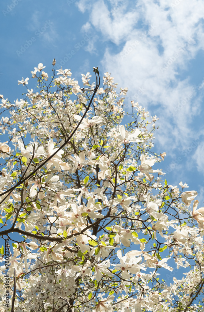 Branches of a flowering magnolia against the background of the blue sky. Vertical photo