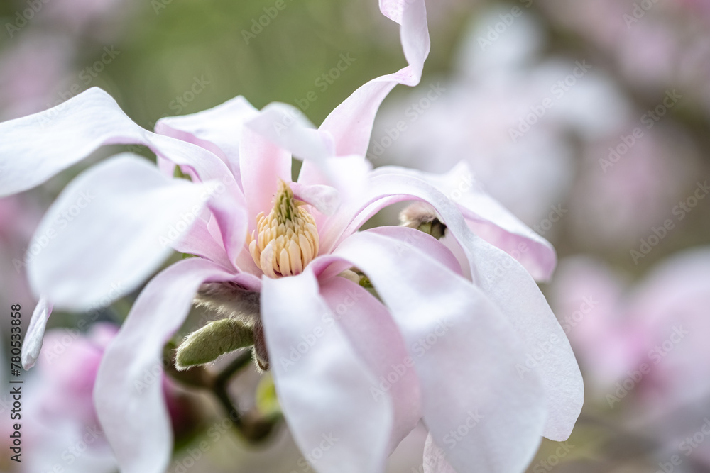 Macro photo of white-pink Magnolia stellate, Siebold and Zucc of spring park. blurred foreground