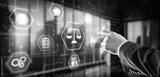 Justice and law concept. Icon Law on virtual screen. Blurred background