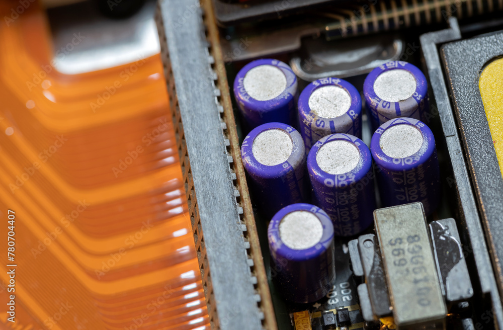 Electronic components inside a generic electric device, computer, data paths, capacitors object macro, extreme closeup detail, copy space, nobody. PC parts electric components simple concept, nobody