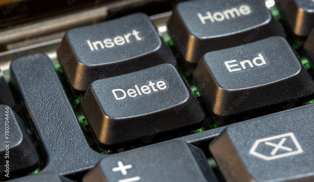 Focus on a delete key on a simple laptop computer keyboard, object macro detail, extreme closeup, nobody. Deleting files, removing content, digital data deletion simple abstract concept symbol