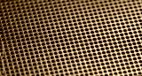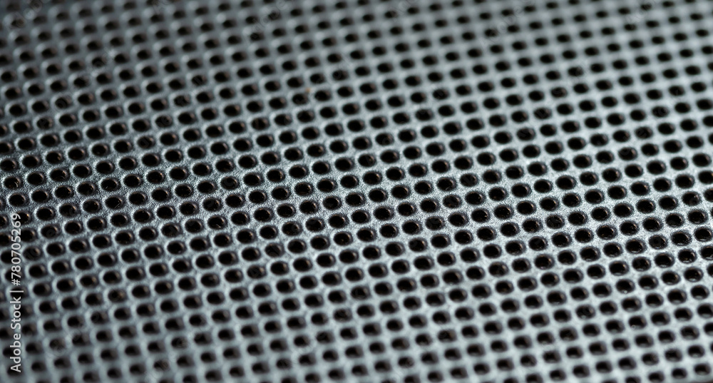 Close-up shot of a detailed perforated metal surface background texture, pattern of small, uniform holes with a selective focus, shallow depth of field. Strong material shiny steel backdrop, nobody