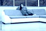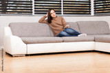 young woman looking tv at home