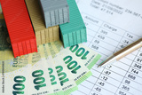 Global business container cargo ship in import export business logistic. Company shipping and logistics in European Union with euro money bills and pen close up