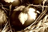 Brown Easter egg dyed with onion peels with a pattern of fresh fresh leaves in a wicker basket