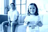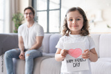 Focused little small girl daughter holding card to congratulate her dad with father`s day. Family celebration, spending time together. Parenthood and fatherhood