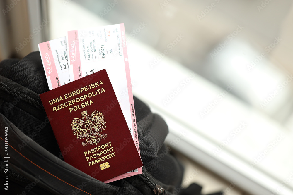 Poland passport with airline tickets on touristic backpack close up. Tourism and travel concept