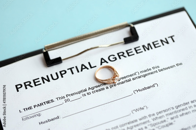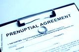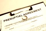 Prenuptial agreement and wedding ring on table. Premarital paperwork process close up