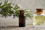 A bottle of aromatherapy essential oil with fresh blooming rosemary