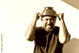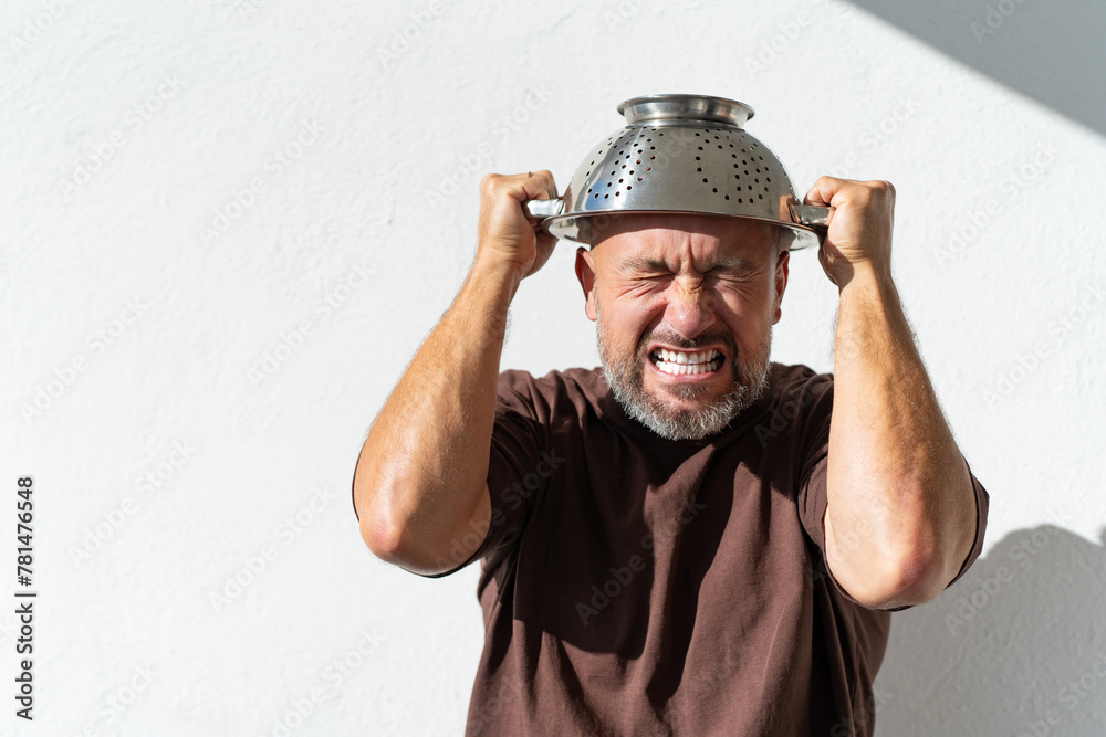 bearded cheerful man with a colander on his head. cheerful portraits of a man with a colander