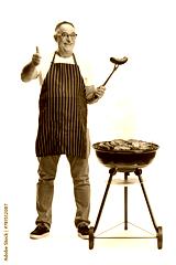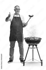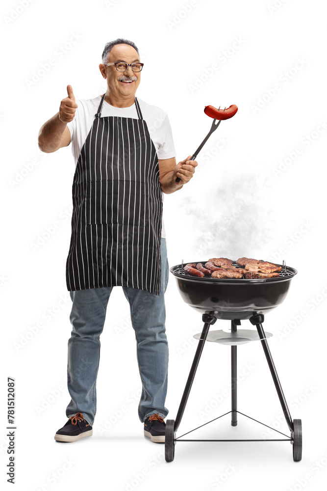 Mature man baking meat on a barbecue grill and holding a sausage with a fork