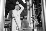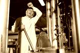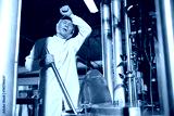 senior worker feeling tired from work beside large industrial pot in the factory