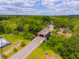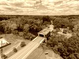 Pepperell Covered Bridge on Nashua River aerial view near Pepperell historic town center in summer, town of Pepperell, Massachusetts MA, USA.