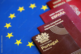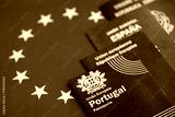European union countries passports on blue EU flag close up. Portugal, Spanish, French and Italian passports
