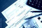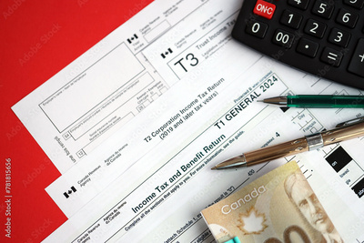 Many blank Canadian tax forms lies on table with canadian money bills, calculator and pen close up. Taxation and annual accountant paperwork in Canada