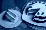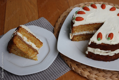Sliced homemade carrot cake with mascarpone cream cheese icing and mini marzipan carrot decorations