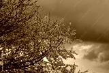 Cherry tree in bloom with flowers on tree against stormy sky Springtime background with selective focus. Prunus avium
