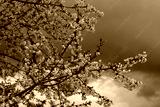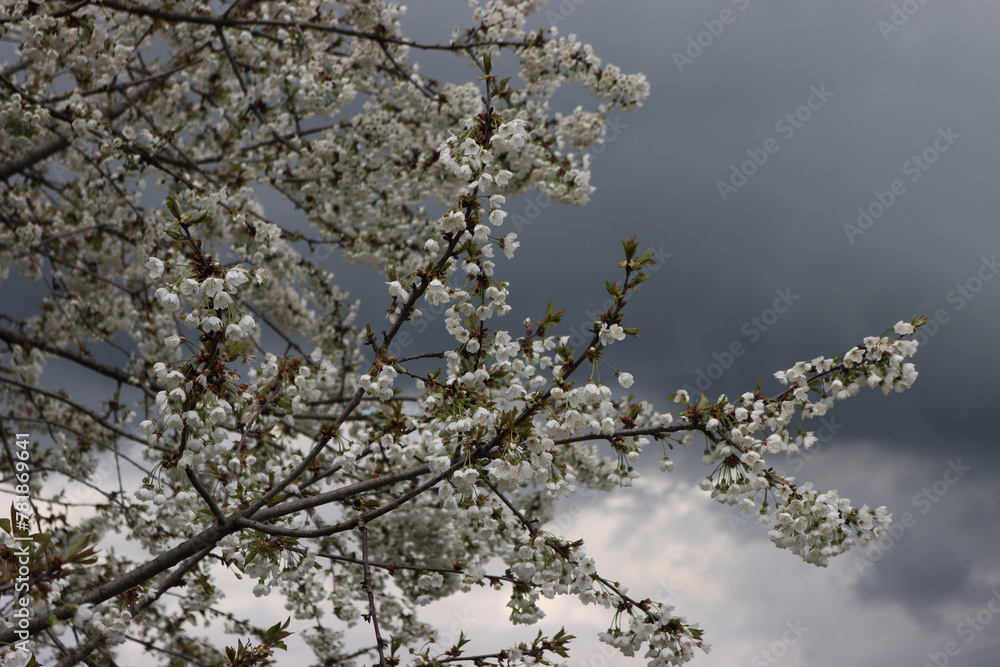 Cherry tree in bloom with flowers on tree against stormy sky Springtime background with selective focus. Prunus avium