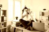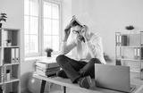 Tired, stressed, frustrated, burned out business man or office employee covering his head with a book and sitting on a work desk between a laptop computer and paperwork. Burnout concept