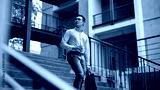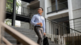 A confident, determined Asian businessman walking down the stairs, looking away from the camera.