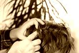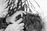Mother's hands searching for insects in hair school-aged child, close-up head, regular hygiene and pest control, Mother's care