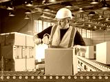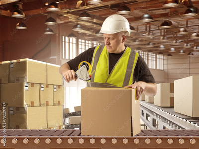 A man in a warehouse seals a box with duct tape. A warehouse with a conveyor line along which the boxes are traveling. A man works in a warehouse.