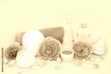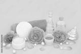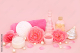 Rose flower health spa beauty treatment products on pink. Natural feminine healthcare for sensitive skin, with moisturizer, aromatherapy oil, scrub, rosewater, shells, pearls and flowers.