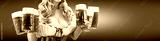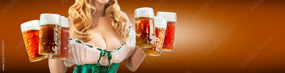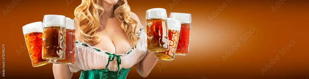 Oktoberfest girl waitress. Woman in dirndl serving big beer mugs on isolated background. Traditional Bavarian, German, Austrian party, autumn festival.
