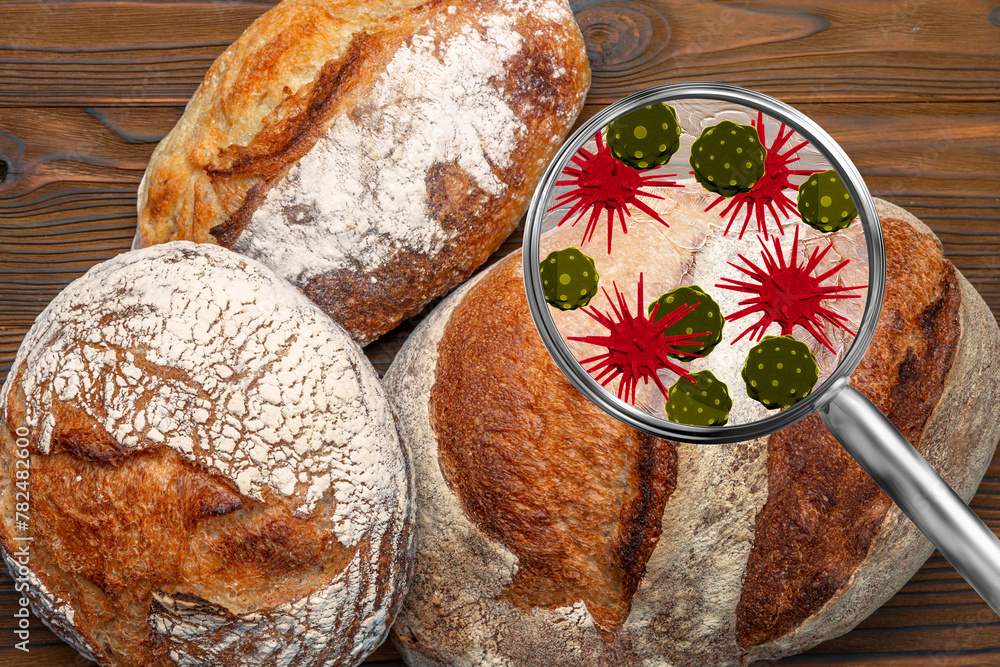 Magnifying lens with simulated germs, viruses, bacteria, food allergy, intolerance to gluten concept. Bread on a wooden board