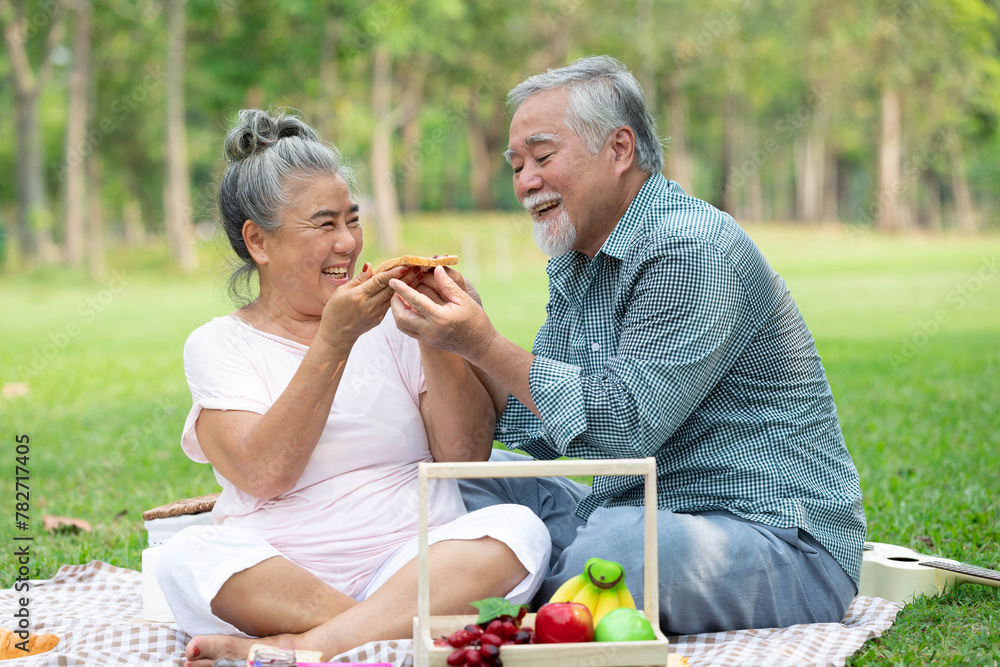 senior couple have a picnic in the park and eating bread with grape jam