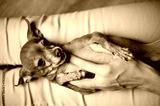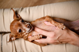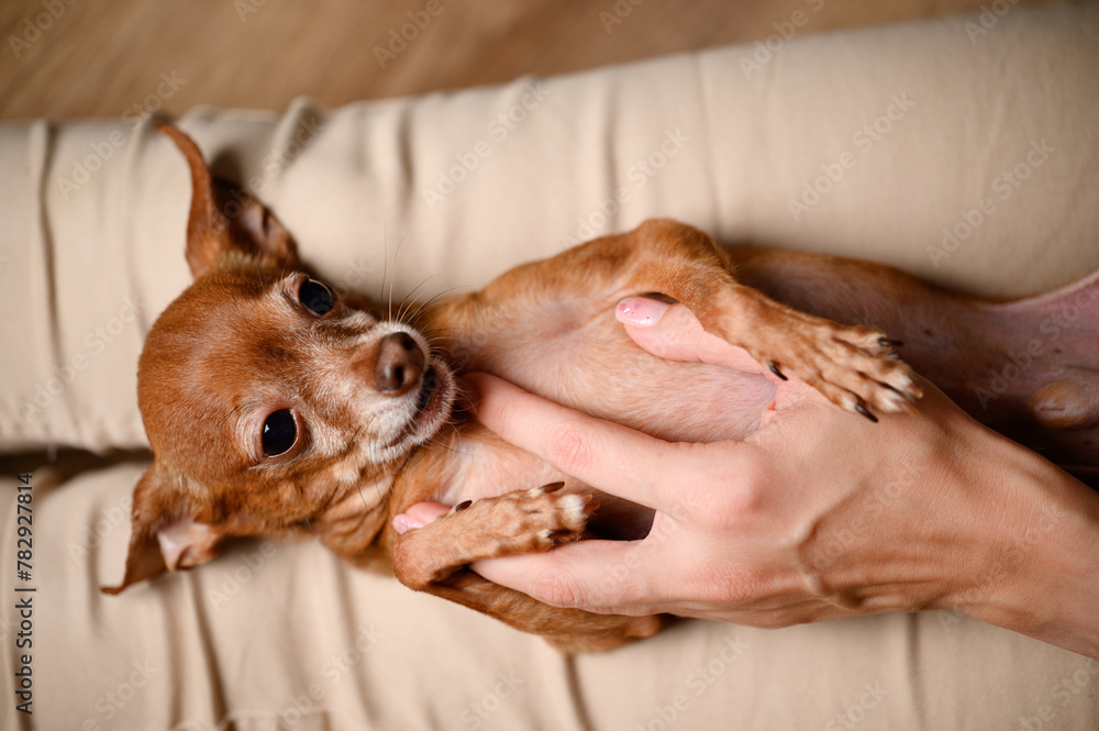 Woman sits on floor in apartment and holds her pet in her arms, resting after everyday work. Mini-toy terrier dog lies on owner lap, owner strokes his belly, close-up.Concept of care, love for pets.