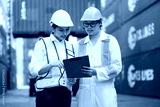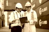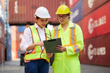 workers or engineers talking about work or project in containers warehouse storage