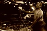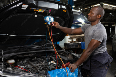 mechanic worker fixing and checking a car air conditioning system in automobile repair shop