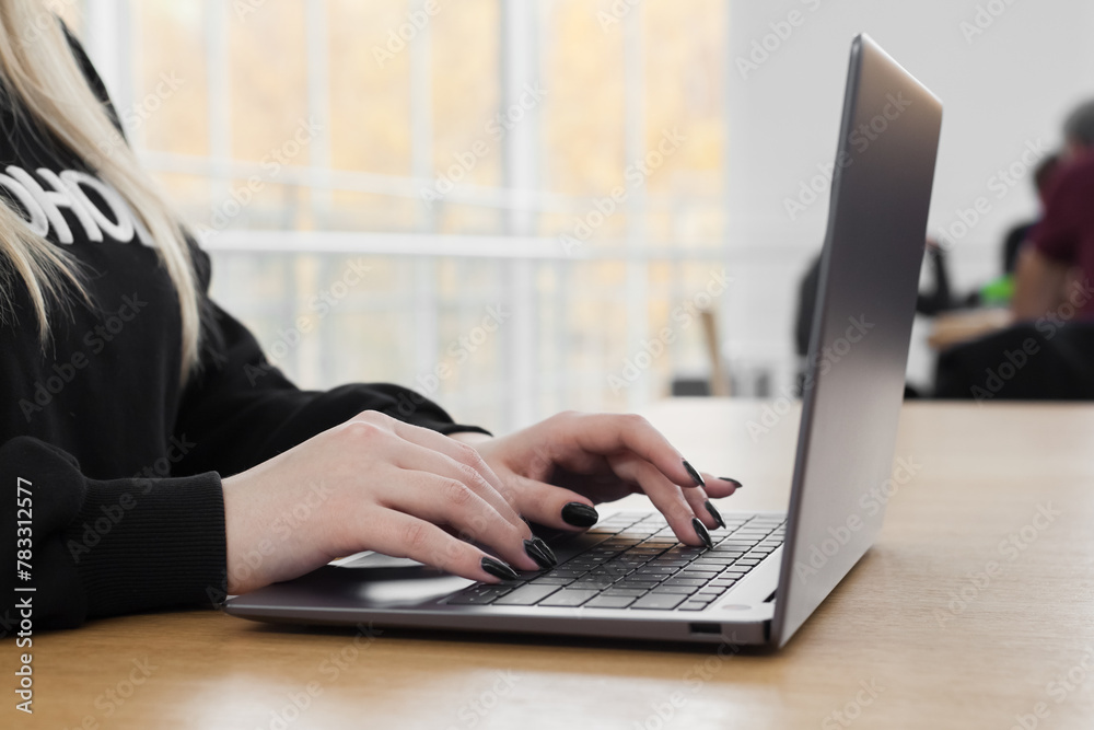 Young white caucasian woman working on computer on wooden table in home office. close up female businesswoman hands typing text on keyboard, surfing internet on modern laptop. mock up, top front view
