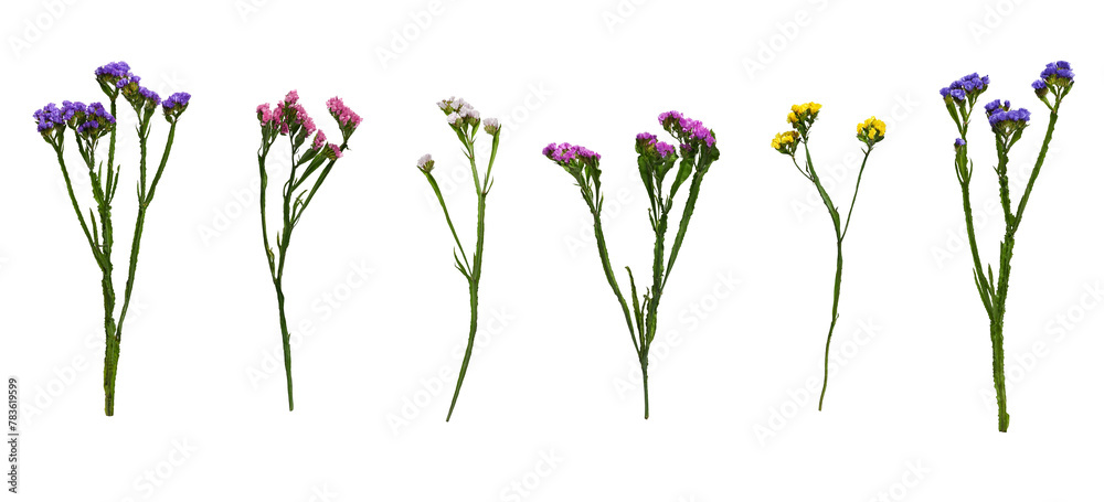 Set of of fresh colorful flowers Limonium sinuatum (Statice) isolated on white background. Elements for creating designs, cards, patterns, floral arrangements, frames, wedding cards and invitations.
