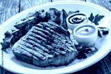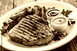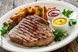 Grilled beef sirloin steak with baked potatoes on wooden table