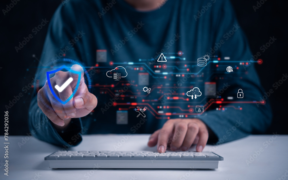 A hand interacts with digital cybersecurity elements over a keyboard, cloud cybersecurity and protection hacker data network digital technology information online.