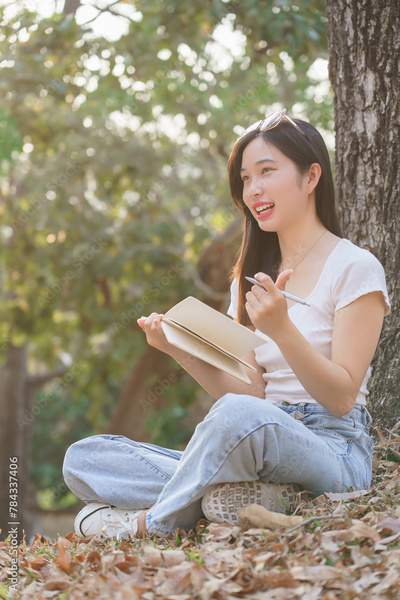 Young asian women sitting on grass under the tree to writing business data and journey dairy in notebook while enjoying and happiness to relaxation with journey travel lifestyle in the nature park