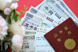 Light blue and red Japan Health Insurance cards on table with japanese residence card and my number card close up