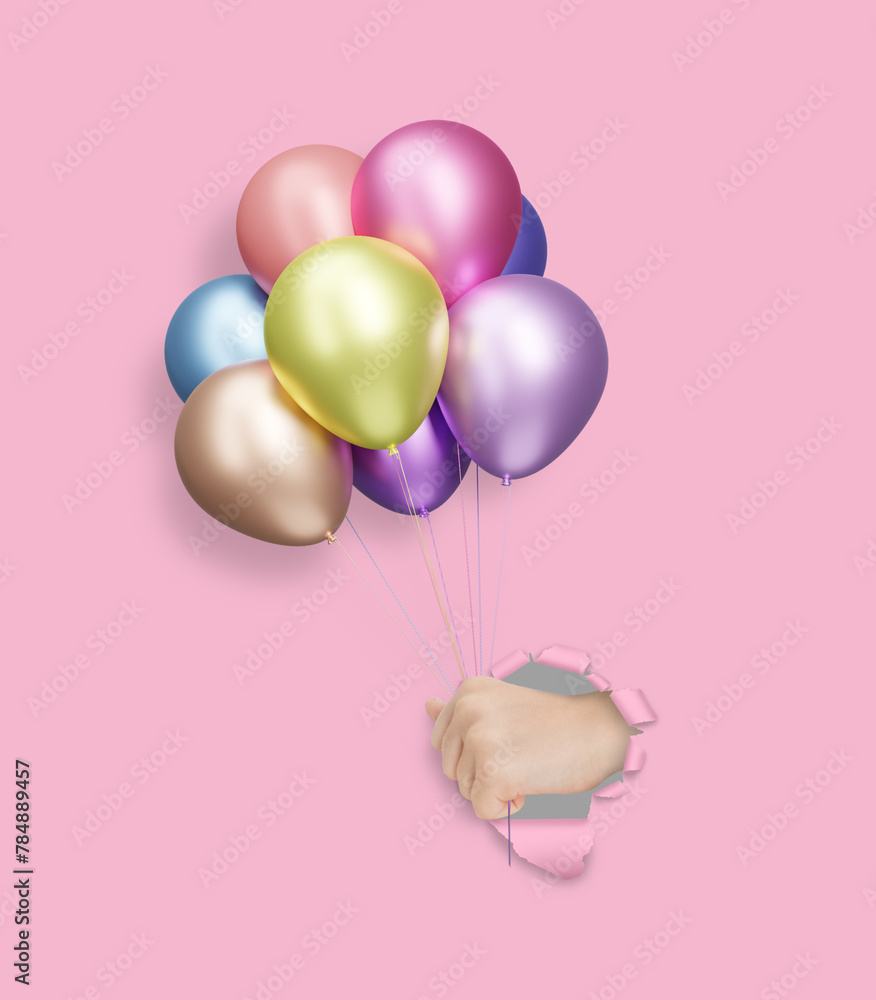 Childrens hand holding shiny colorful matte balloons through the hole in pink paper