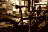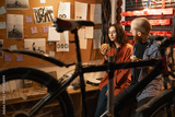 Couple in love chats happily and eats delicious burgers after fixing and servicing a bicycle in repair shop. People working and eating in garage
