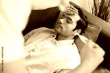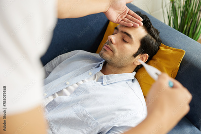 young man sleeping on the bed and her friend checking with a digital thermometer for measure body temperature