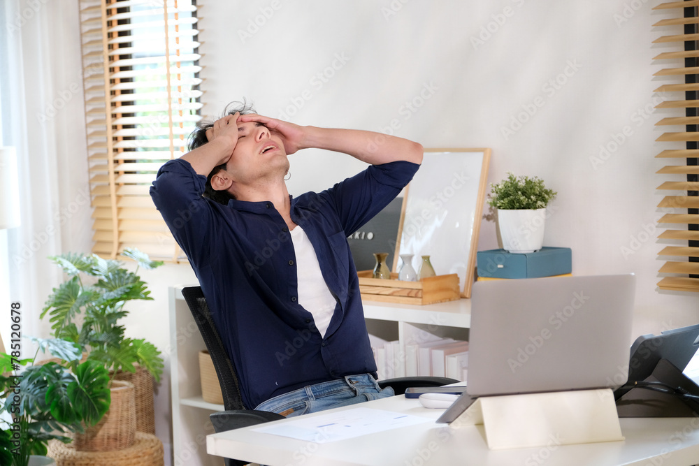 Young man take a break while working with computer at home, Overworked freelancer relax from laptop